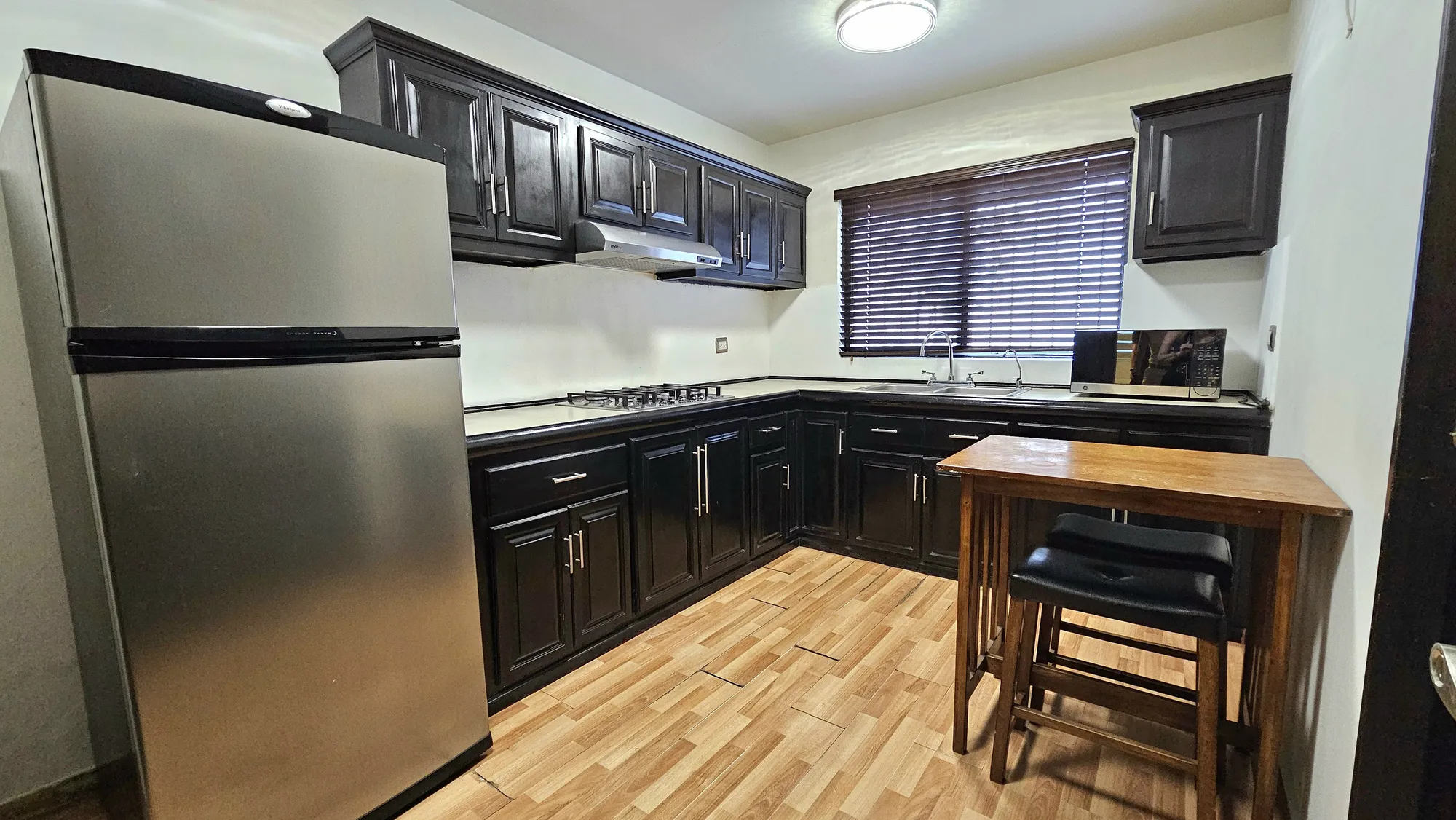 espejo; cocina integral con parrilla, campana, refrigerador, microondas, mesa