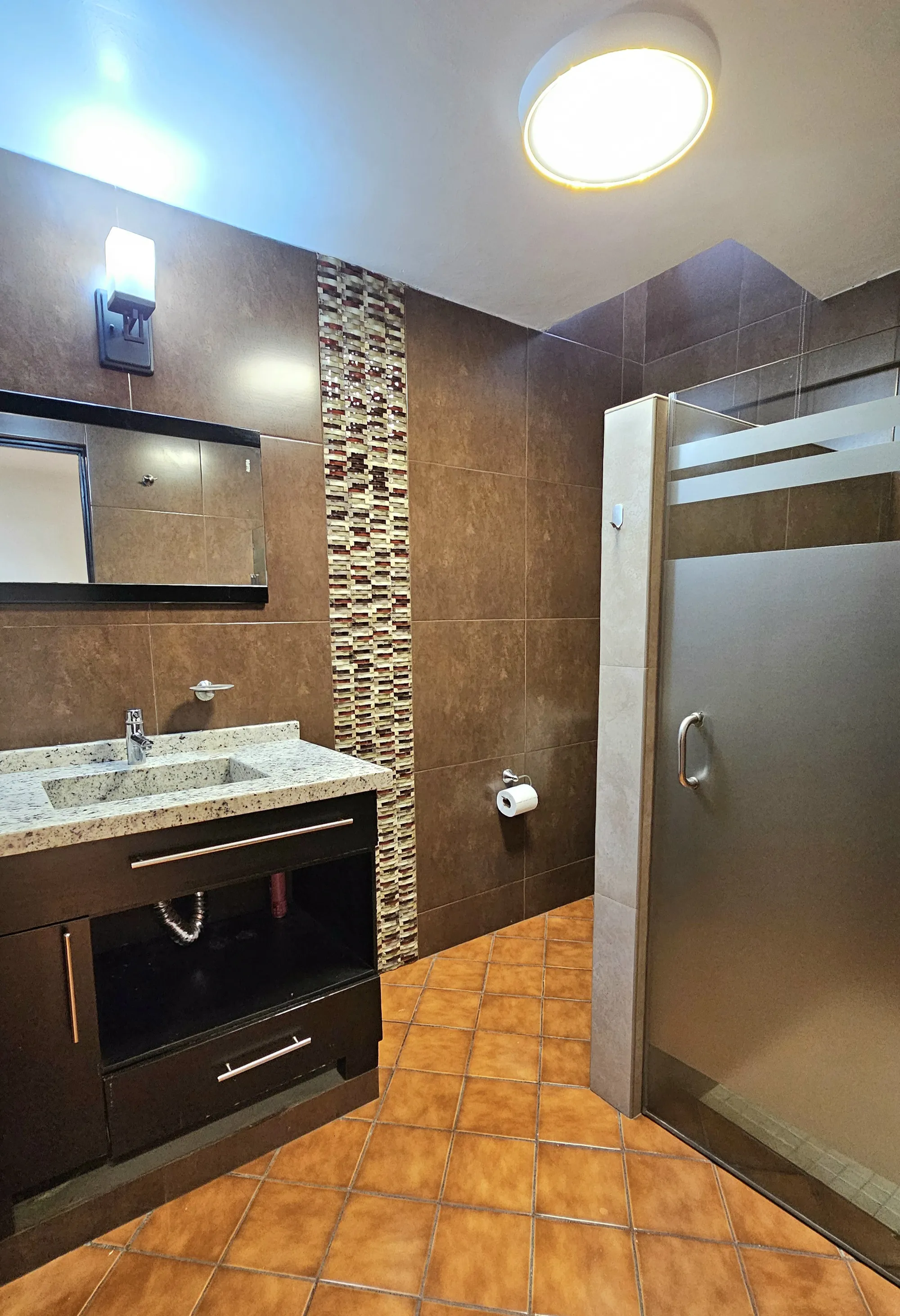 de granito, mueble de madera y espejo, regadera separada con puerta de cristal