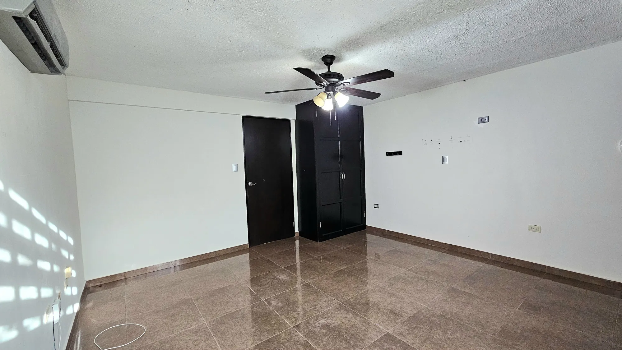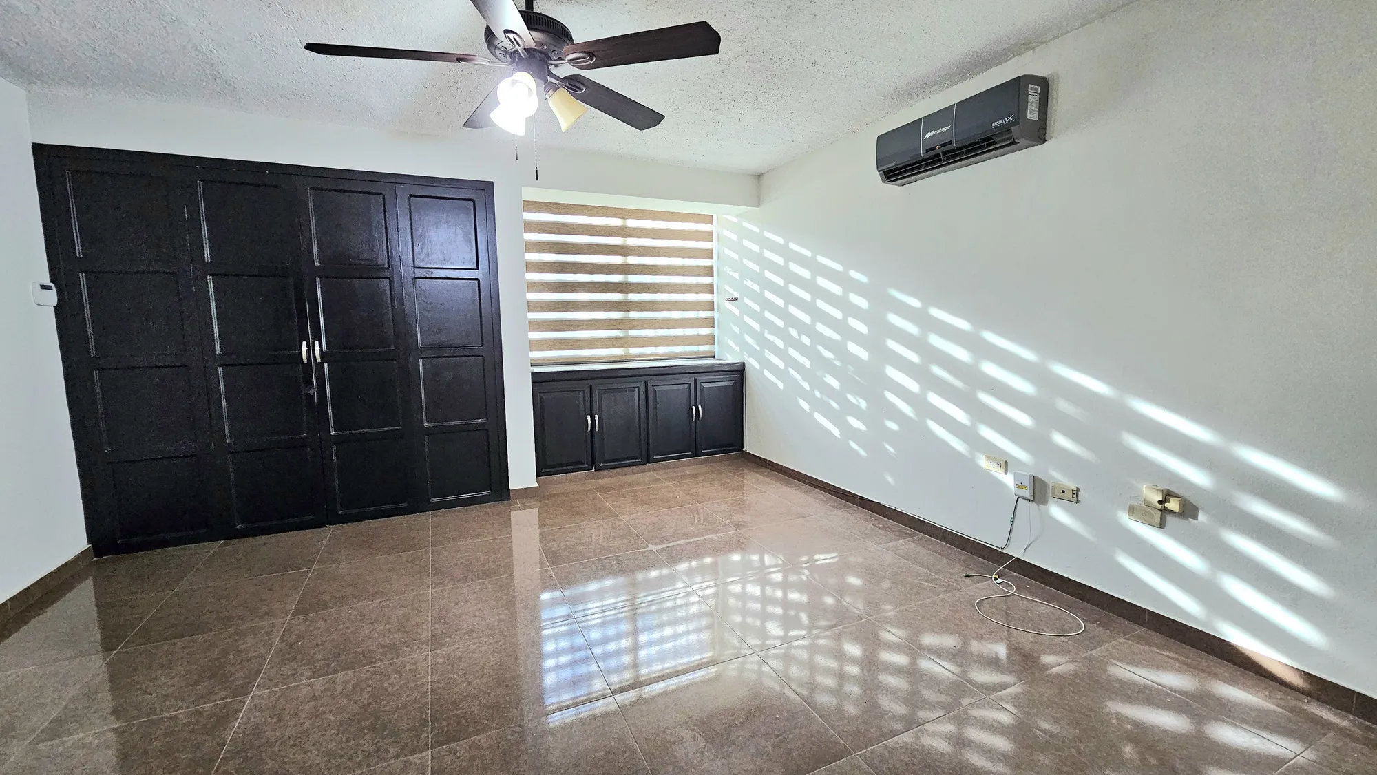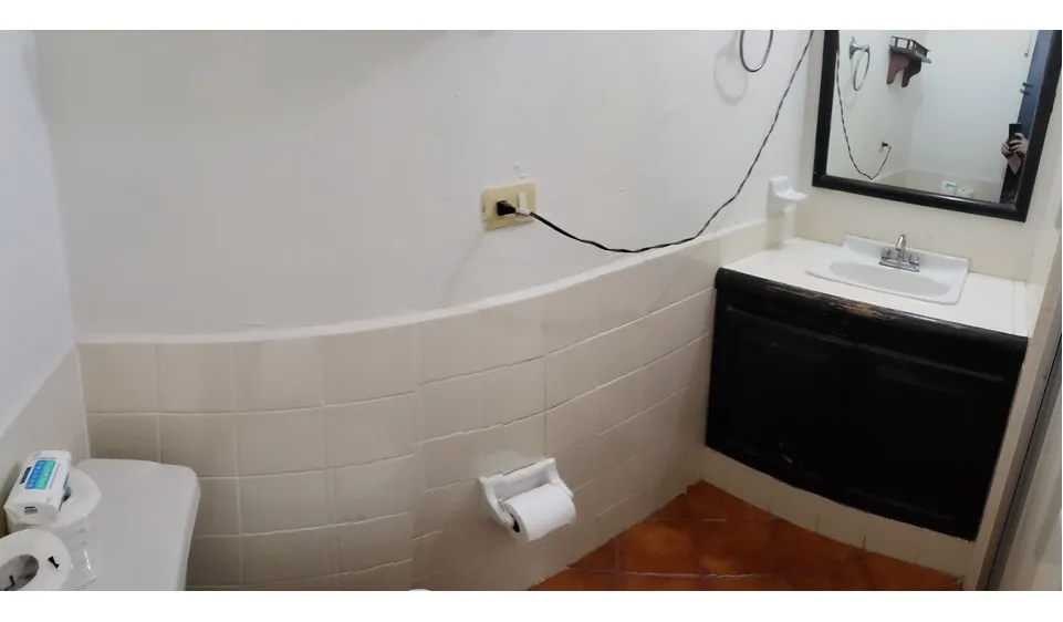persianas, abanico de techo y minisplit de 1 ton; baño completo con lavamanos
