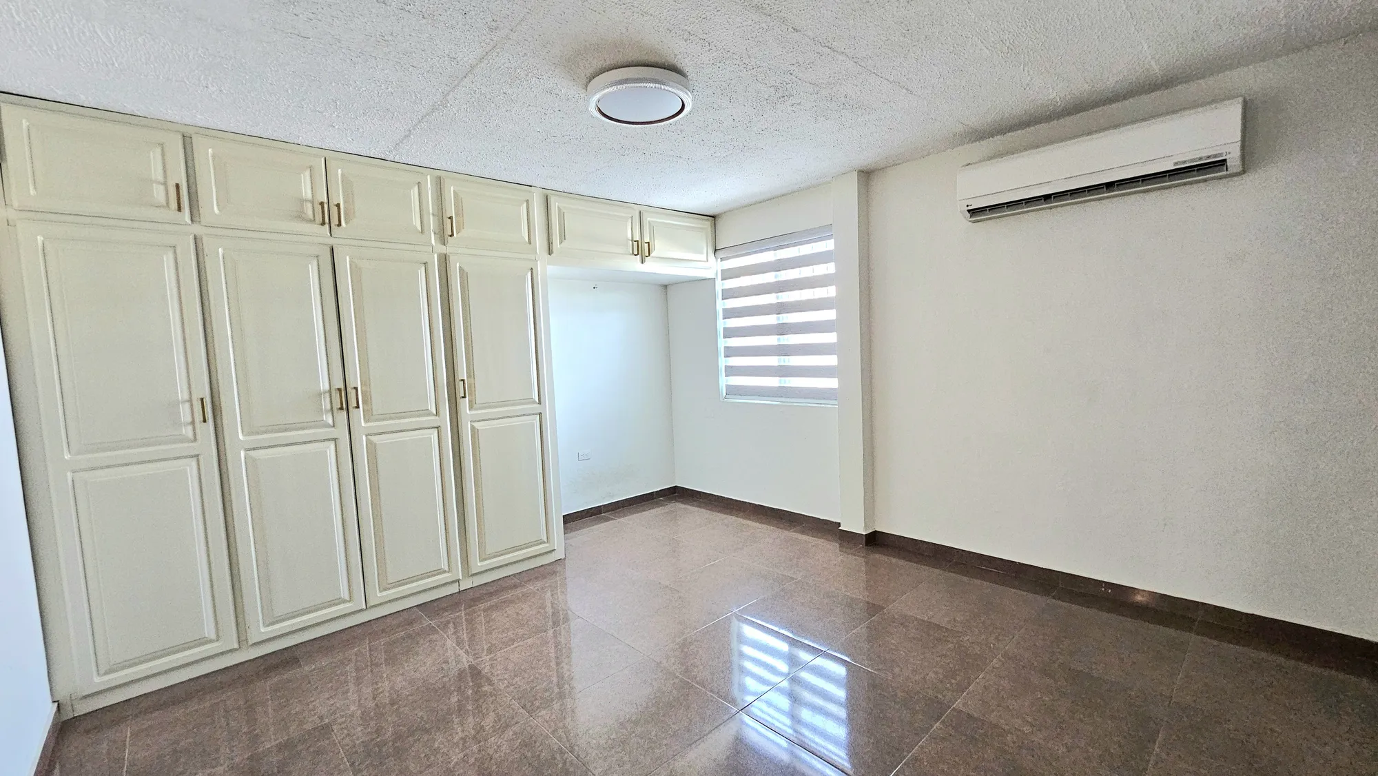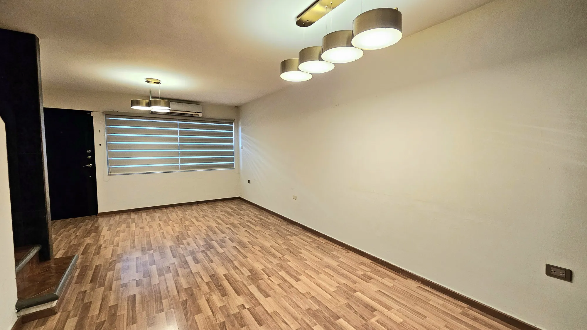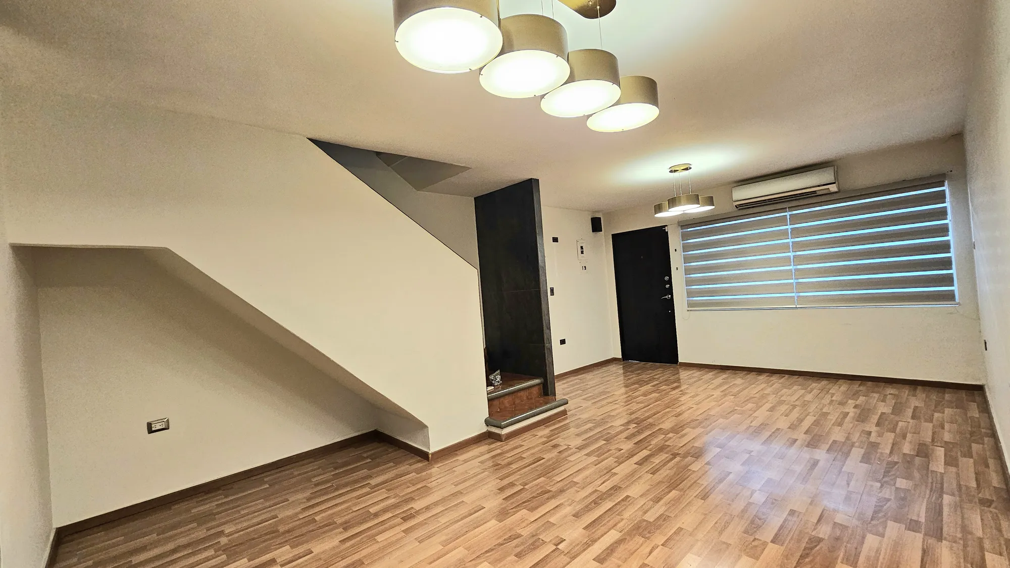 persianas, abanico de techo y minisplit de 1 ton; baño completo con lavamanos