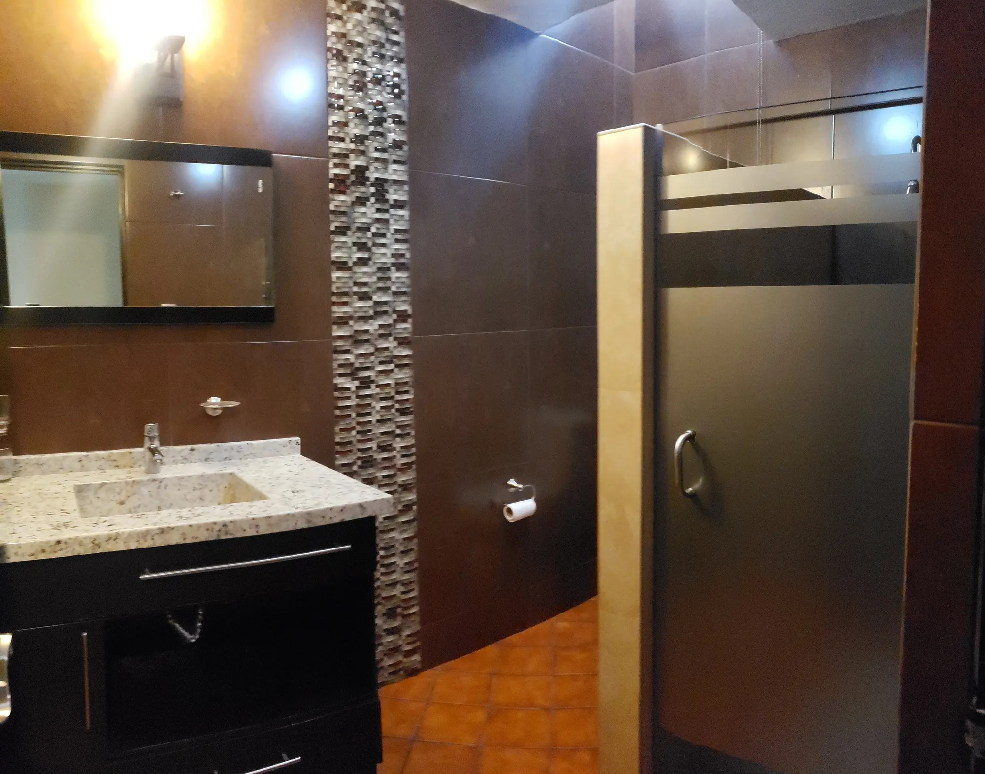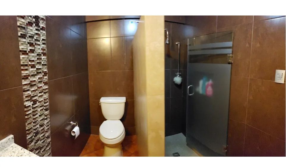 de granito, mueble de madera y espejo, regadera separada con puerta de cristal