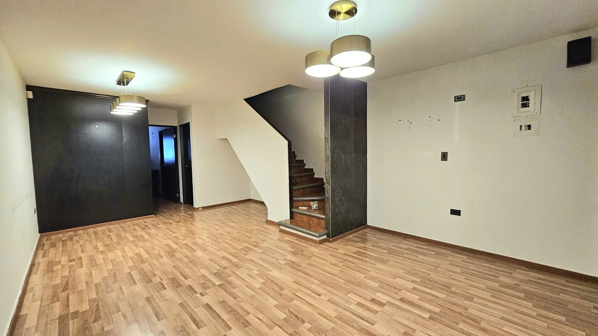 laminada en sala, comedor y cocina; piso cerámico en escaleras recámaras y baños,